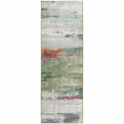 Elevate your space with the exquisite artistry and vibrant charm of our Power Loomed Indoor/Outdoor Runner Rug. This stunning piece, meticulously crafted in Egypt, features a dynamic interplay of GREEN, BLUE, and PURPLE hues, creating an abstract expressionist tapestry that will infuse your home with contemporary elegance.Sized at a practical 2′-8″ X 8′, with a subtle height of 1/4″, this runner rug is perfect for halls, entryways, or any area that begs for an elongated touch of style. The composition of 76% Polypropylene, 23% Polyester, and 1% Backing material lends itself to durability and comfort, ensuring this rug can withstand the demands of both indoor and outdoor environments.OEKO-TEX certification guarantees that the rug is free of harmful substances, providing peace of mind for you and your loved ones. With its weather-resistant qualities and fade-resistant colors, this versatile rug brings both beauty and utilitarianism to your home.The power loomed construction not only reflects impeccable quality but also ensures precision in every detail of the pattern, as depicted in the image. Whether placed in a sun-soaked patio or a high-traffic hallway, this rug maintains its allure, making it a timeless addition to your decor collection.Invite the essence of modern art into your home with this stunning runner rug, a fusion of artistic design, innovative craftsmanship, and environmental consciousness.