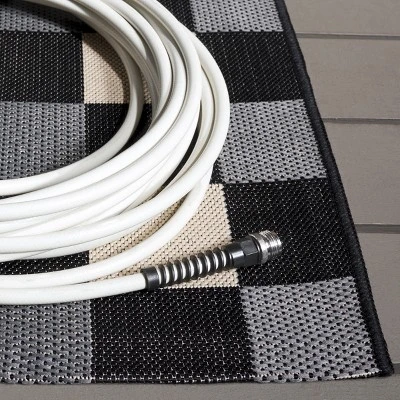 - Indoor-outdoor rugs are made with durable synthetic materials to help them to withstand high traffic and natural weather elements. Outdoor rugs can be cleaned with a bit more vigor, such as rinsing a rug with a garden hose to remove excessive grime. Dry indoor-outdoor rugs over a railing in the sunlight on both sides instead of placing it on a wooden deck or stone patio, which can encourage the growth of moss or mold on a damp rug.