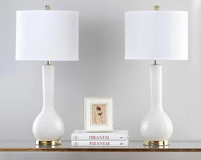 Inspired by a classic pottery form, this single gourd ceramic lamp with extra-long neck lends a stately but contemporary presence in any room. This artful lamp is complemented with a contemporary white cotton drum shade. Care Instructions: Before cleaning any lamp shade or fixture, disconnect the power source. Wipe with a soft, dry cloth. Avoid the use of chemicals and household cleaners as they may damage the finish.