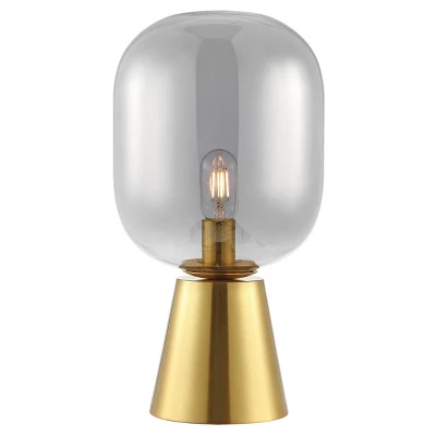 Illuminate your space with the Rain table lamp. This 18 inch masterpiece in smoke grey and brass combines glass and metal for a look that is both modern and timeless. The subtle smoke grey glass offers a soft, diffused glow, while the brass base adds a touch of elegance to any room. Perfect for your living room, bedroom, or office, this lamp serves both as a functional piece and a stylish decor element. Its harmonious design complements various interiors, making it a versatile addition to your home. Experience the fusion of form and function with the Rain table lamp and create an inviting ambiance that suits any occasion.