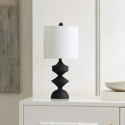Add a modern and sculptural focal point to your home with our Riza table lamp. The refined and bold geometry of the lamp lends a dose of interest and charm. It showcases voluminous shapes to attain an eye-catching and distinct silhouette. Crafted in resin with a sleek black finish and a tall white drum shade, our table lamp serves as a bold and striking addition to any room. It filters a soft and warm glow to serve as the perfect statement piece for your nightstand, console, or end table. Care Instructions: Before cleaning any lamp shade or fixture, disconnect the power source. Wipe with�a soft, dry cloth. Avoid the use of chemicals and household cleaners as they may damage the finish.