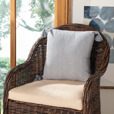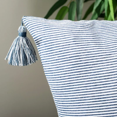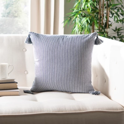 Make a stylish statement with a pop of bold color with this Safavieh Sidney Pillow. Perfect for any sofa, armchair or loveseat, its chic, contemporary clean lines and stripes make it a must have for layering with patterns and colors. Its joyful tassels give any room instant flair. Care Instructions: Pillows tend to flatten during transit, but these tips should help you get that pillow into its fluffiest shape quickly!Once unpacked, gently knead the pillow to help loosen the fibers. Throw the pillow in a dryer on a low tumble setting. The most important tip is to include a sock stuffed with a tennis ball to help “beat” the pillow into its fluffy form. Remove from the dryer, and proudly display your new piece of couch art!