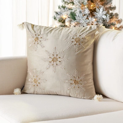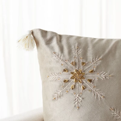 The ideal seasonal accent regardless of dŽcor style, this Simone Snowflake Pillow is both glamorous and understated. SimoneÕs gold beaded accents make its finely stitched snowflake motifs sparkle in any room, and soft beige velvet is luxurious to the touch. The tinsel detail in its pom poms complete the look. Care Instructions: Dry clean only