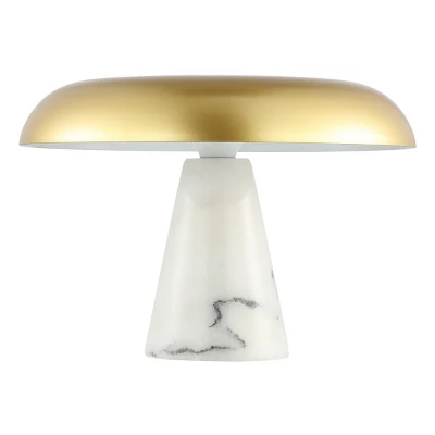 Enrich your space with the elevated drama and elegance of our Vaughan table lamp. With a striking geometry and a rich mix of materials, our table lamp brings impact and texture to any tabletop. It features a sleek and elongated dome shade for added drama and definition. The metallic brass shade is elevated upon a tapered, white marble base to add polish and grace to any corner. Offering focused illumination, our table lamp remains a stylish tone-setter for your bedroom, lounge, or home office. Care Instructions: Unplug lamps before using any cleaning solutions. Dust shades with a feather duster or with an appropriate vacuum-brush attachment. Wipe with a soft, dry cloth and clean lamp bases with the methods appropriate to the material. Avoid the use of chemicals and household cleaners as they may damage the finish.